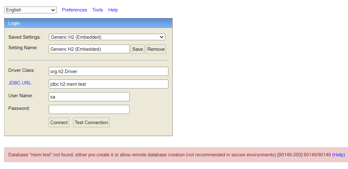 위의 사진가 같이 mem:test database를 찾지 못해서 접속이 되지 않는 문제가 발생됩니다.
